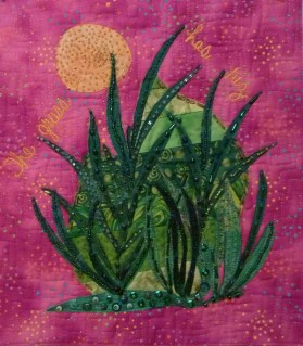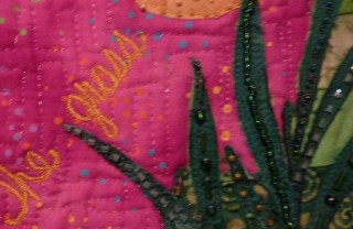 The center background is randomly pieced and the design elements are fused.  The technique is very improvisational and FUN! I was first introduced to it a couple of years ago at a class taught by Deana Hartman.  (http://chameleonquilts.com)   One of the best classes I’ve taken.