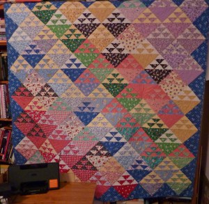 I used Thirties Reproduction fabrics to make this Birds in the Air quilt. It is based on a very traditional pattern from Quilt in a Day. All half square triangles were made the old fashioned way – no paper.