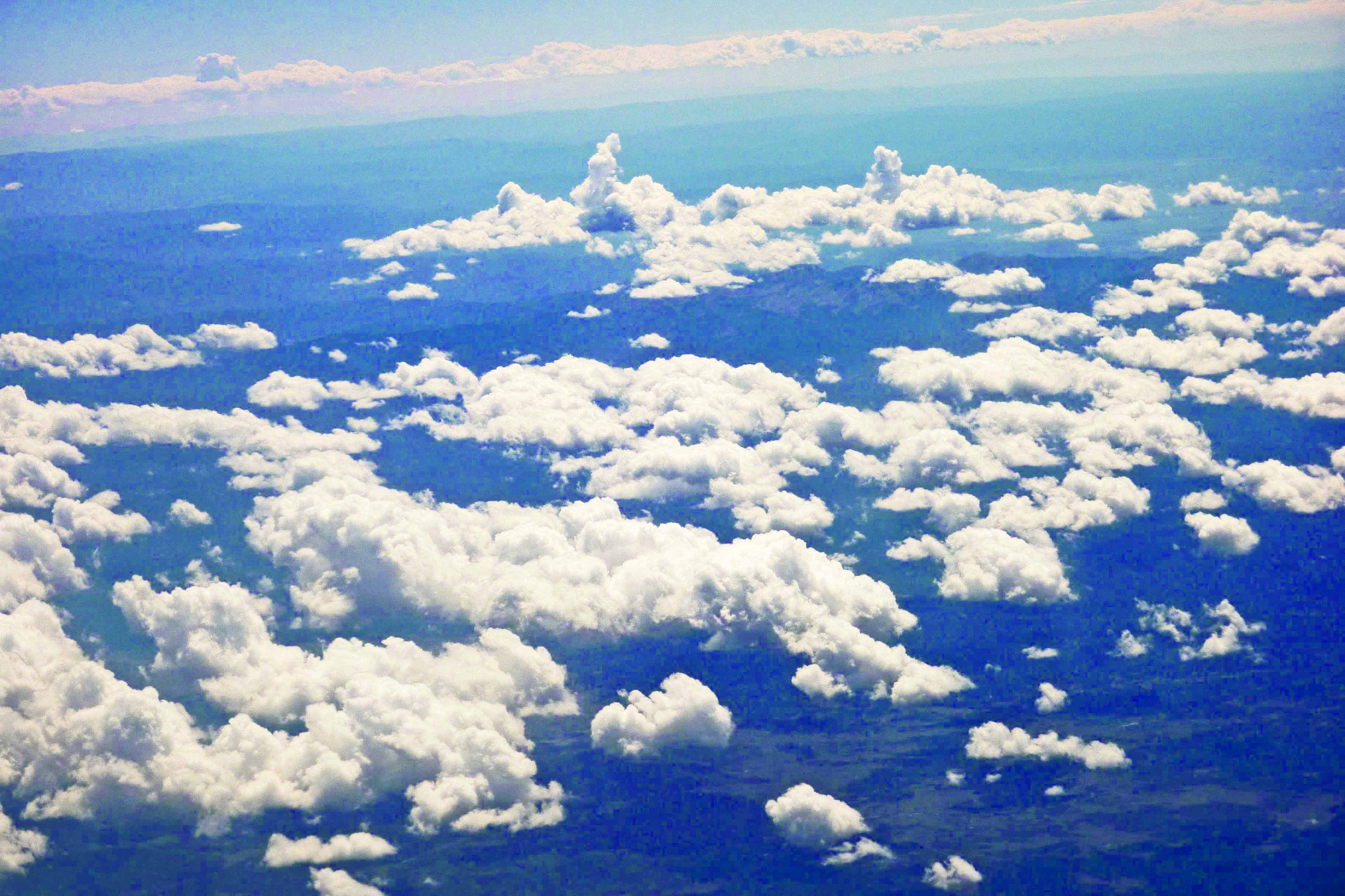 …So I’m sitting here in my window seat writing, staring at some particularly fluffy clouds only partially obscuring my vision of the land beneath. Some of the cloud peaks are magnificent reminding me of mountain peaks; others of peaks of whipped cream. Still others are spread out and breaking up like ice floes on a tranquil sea of sky blue.