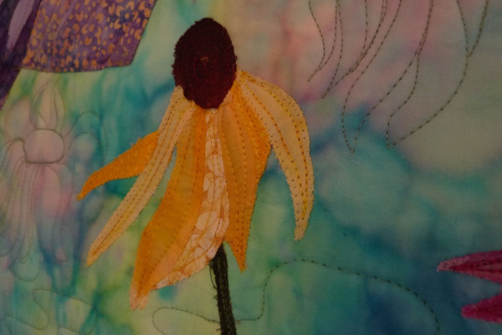 I finally took a photo of this quilt – completed. It’s one of my earliest art quilts – 2007 – and it is from a pattern by Wendy Butler Berns. I started this quilt in Wendy’s workshop at the Glendale Quilt Show. She was teaching a technique for turning your favorite photos into art quilts. It was an excellent workshop.