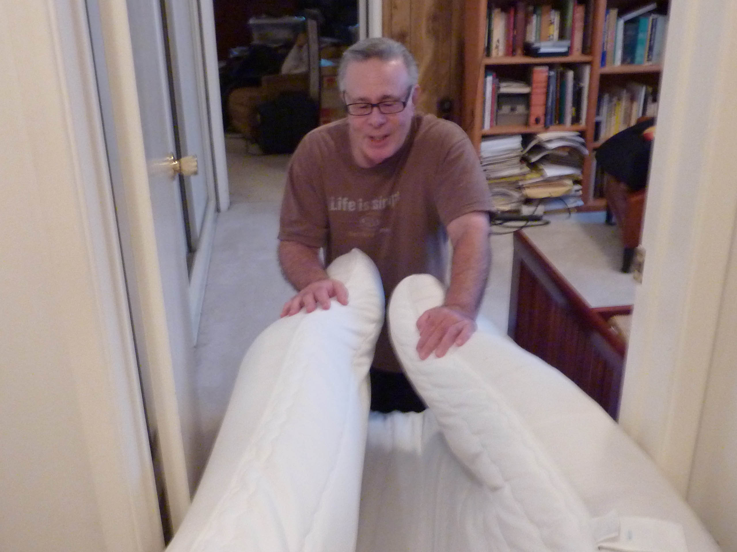 Picture this – a queen size mattress – a relatively narrow door – 2 height challenged people