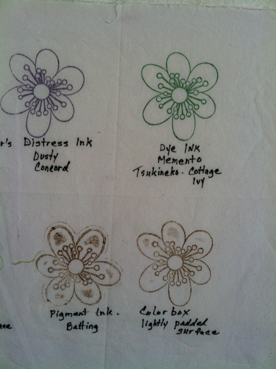 The pigment ink from Colorbox left a smudgy outline. I tried it on a lightly padded surface, over batting and on a hard surface. The hard surface was best but still not as distinct as the Dye Inks.