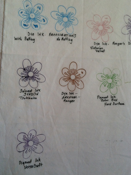 In my opinion the best performers were the dye inks from the Recollections and Memento (Tsukineko) lines. I stamped with Recollections with and without batting under the muslin and definitely got a crisper edge without the batting.