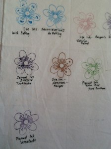 NOTE: Because I’m going to be using these in Art Quilts I did not wash the fabric again after stamping it. So this is NOT a test for washability, simply a comparison of how well the inks did visually on the fabric. I was looking for vibrancy, clarity and crisp edges.