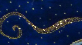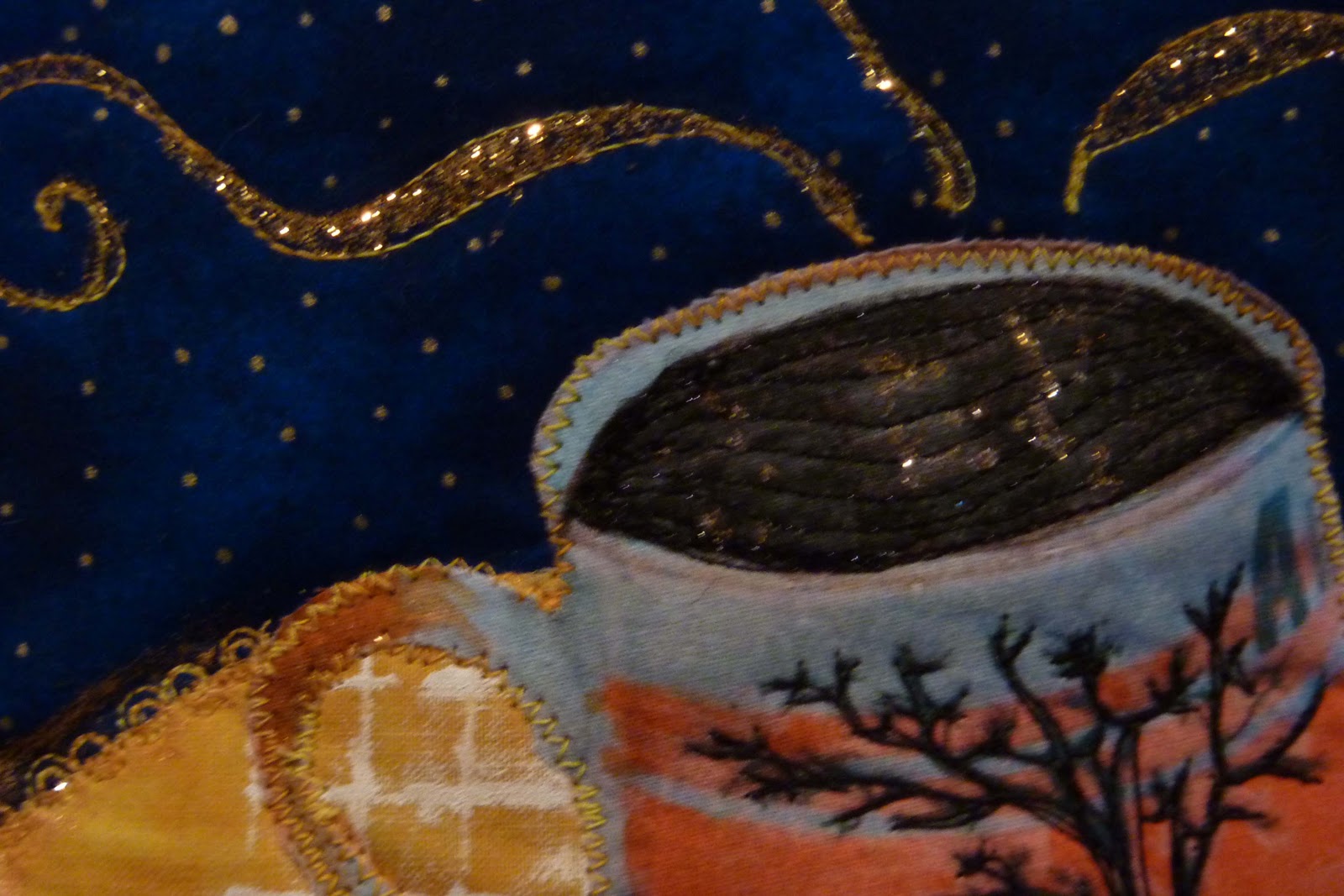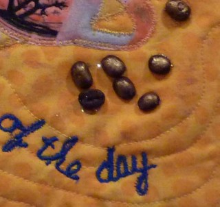 When I declared the thread painting “done” I got out my beads and went to town! Because this will be used for “show and tell” in class I wanted to be sure to incorporate several basic beading stitches. I used moss stitch, scatter stitch, seed stitch, bugle pathways, back stitch and stacked stitch.