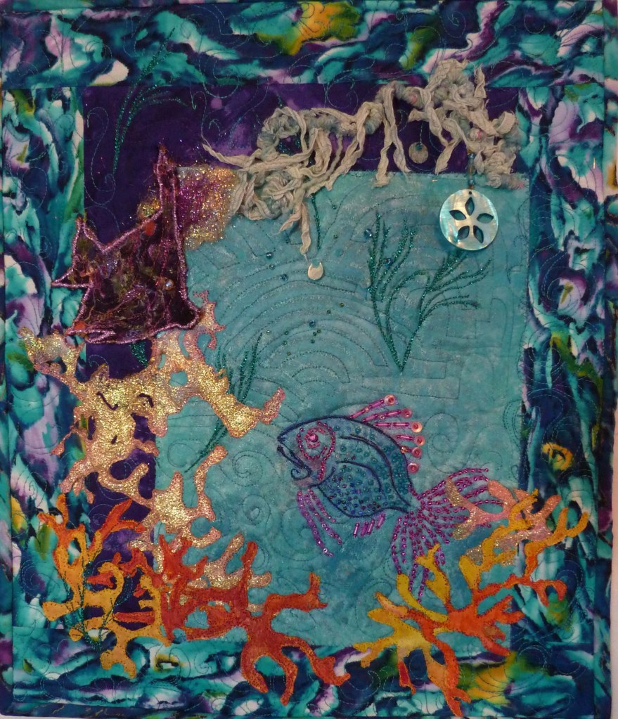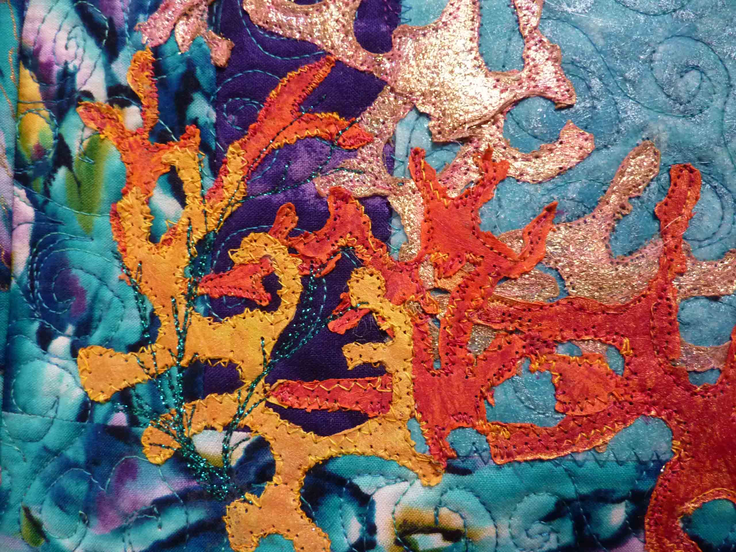 I started with a piece of white PFD Kona cotton and painted the background with an acrylic wash of color. Next I painted the flowers and layered the piece with batting and lining. Then the REAL fun began as I used thread painting to add depth and texture to the design. Here’s where you can really let yourself experiment with color and various thread weights. I particularly liked the look of some variegated 30 wt. thread.