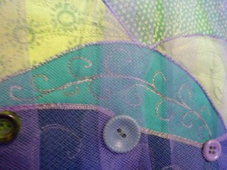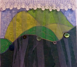 I arranged a piece of tulle over the quilt and tacked it down with vintage buttons. Finally I topped it with a piece of lace (Irish lace?) .