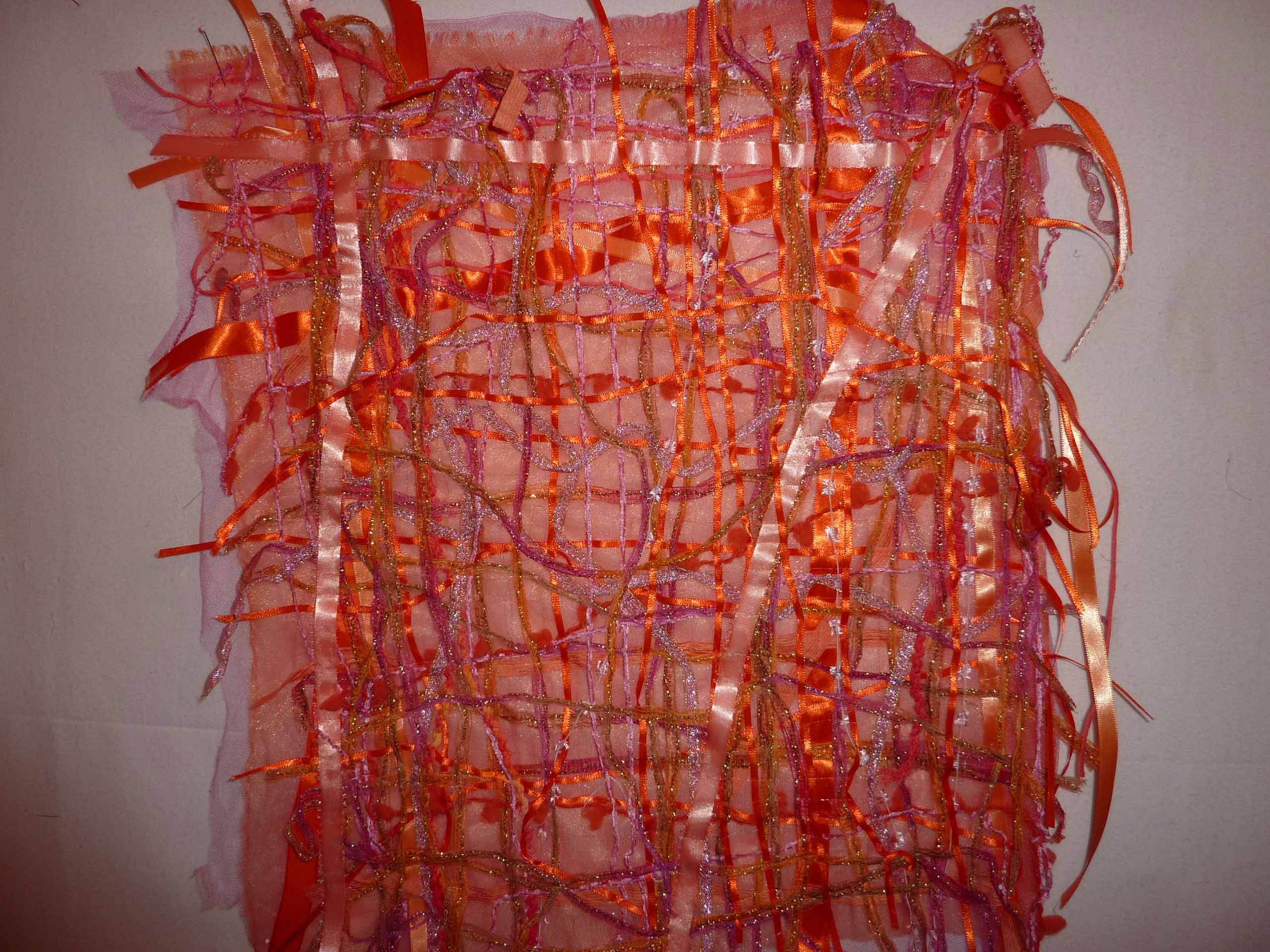 It is collaged ribbons and fibers on tulle. I just washed out all the stabilizer and it’s dry and ready for the next step.